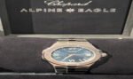 The Chopard Alpine Eagle 41mm with a blue dial is a refined luxury sports watch crafted from Lucent Steel™. It features a textured blue dial inspired by an eagle’s iris, COSC-certified automatic movement, and a sleek integrated bracelet, blending elegance with performance.