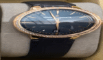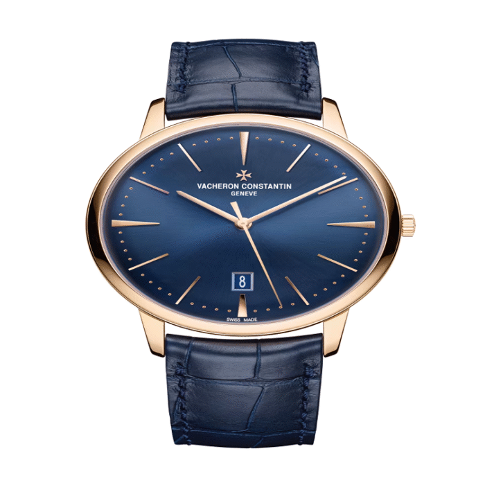 The Vacheron Constantin Patrimony Self-Winding 40mm in rose gold with a blue dial and black leather strap embodies timeless elegance and refined craftsmanship. Its minimalist design and luxurious materials make it a distinguished choice for discerning watch enthusiasts.