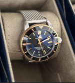 The Breitling Superocean Heritage B20 Automatic 42 Stainless Steel is a 42mm stainless steel dive watch featuring a blue dial with white hour markers, a rotating bezel, and a stainless steel mesh bracelet. It is powered by the Breitling B20 movement, offering precision and a 70-hour power reserve.