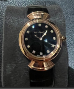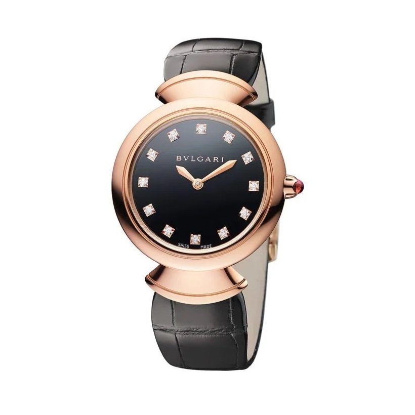 The Bvlgari Diva’s Dream watch with a black face features a 36mm rose gold case, a sleek black dial with diamond hour markers, a diamond-encrusted bezel, and a black alligator leather strap. It offers a perfect blend of luxury, elegance, and precision.