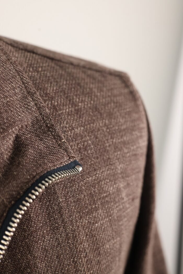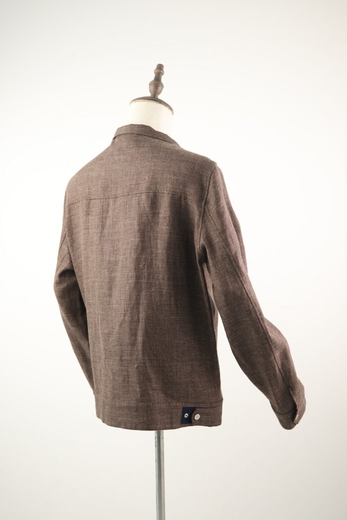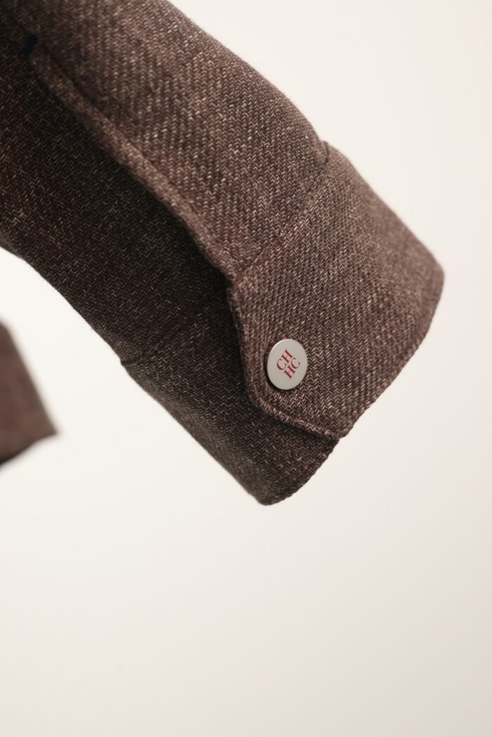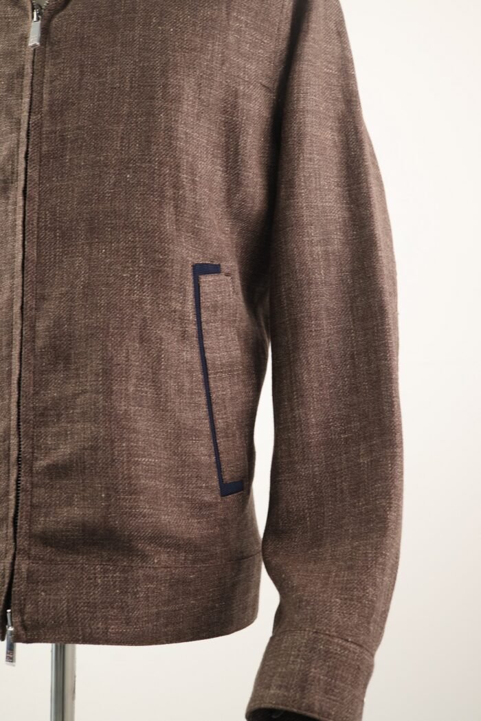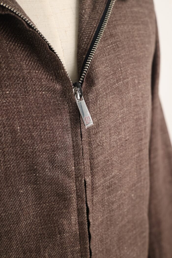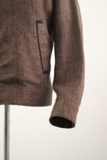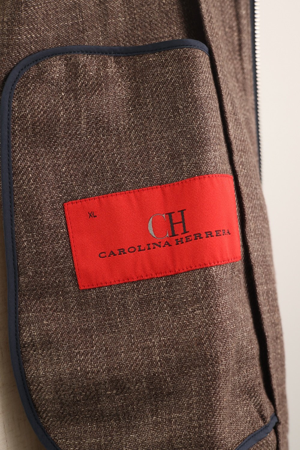 A lightweight brown linen jacket by Carolina Herrera, blending tailored elegance with breathable comfort for effortless warm-weather sophistication.