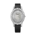 Complementing the case is a luxurious leather strap, secured with a folding clasp, ensuring both comfort and elegance on the wrist. With a water resistance of up to 30 meters, this timepiece is as functional as it is beautiful. The Chopard L’Heure du Diamant is a testament to the brand’s heritage, offering a timeless accessory for the discerning woman.
