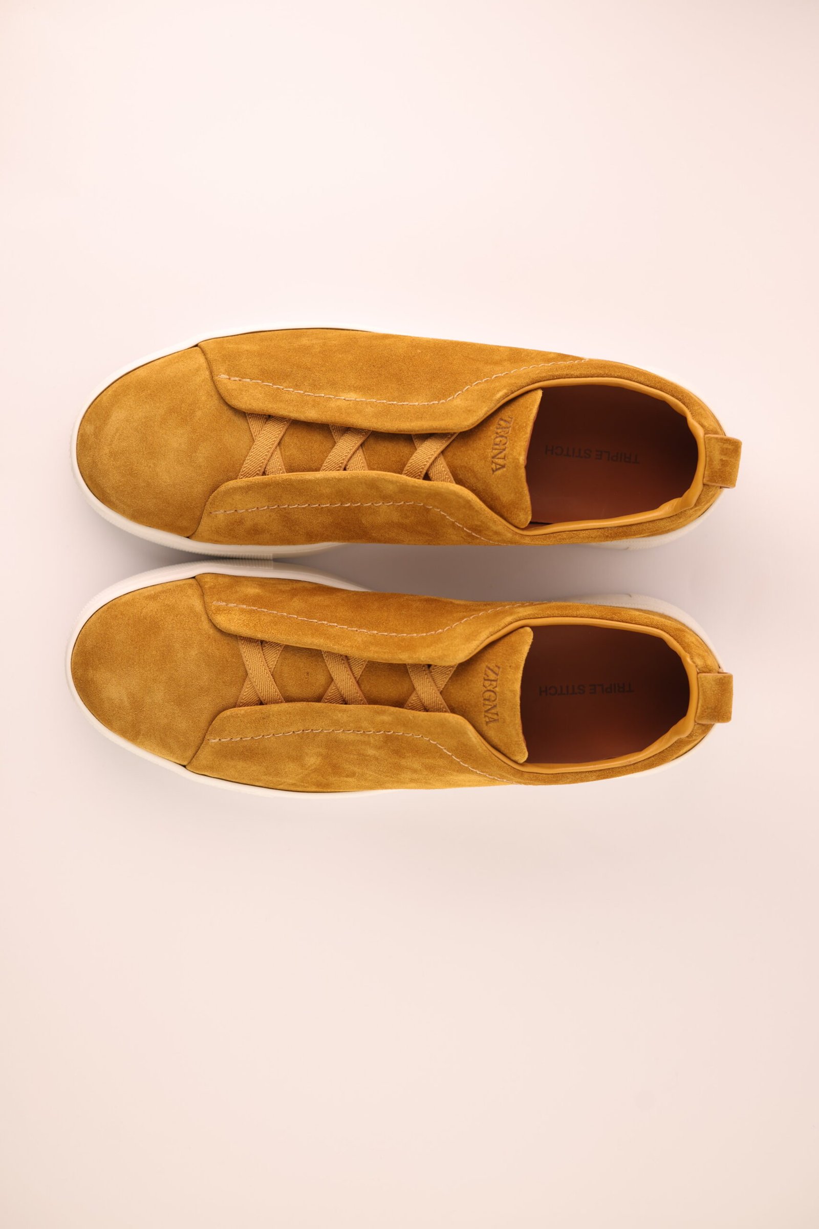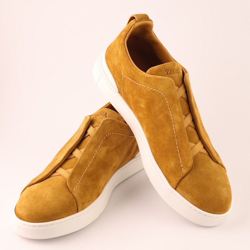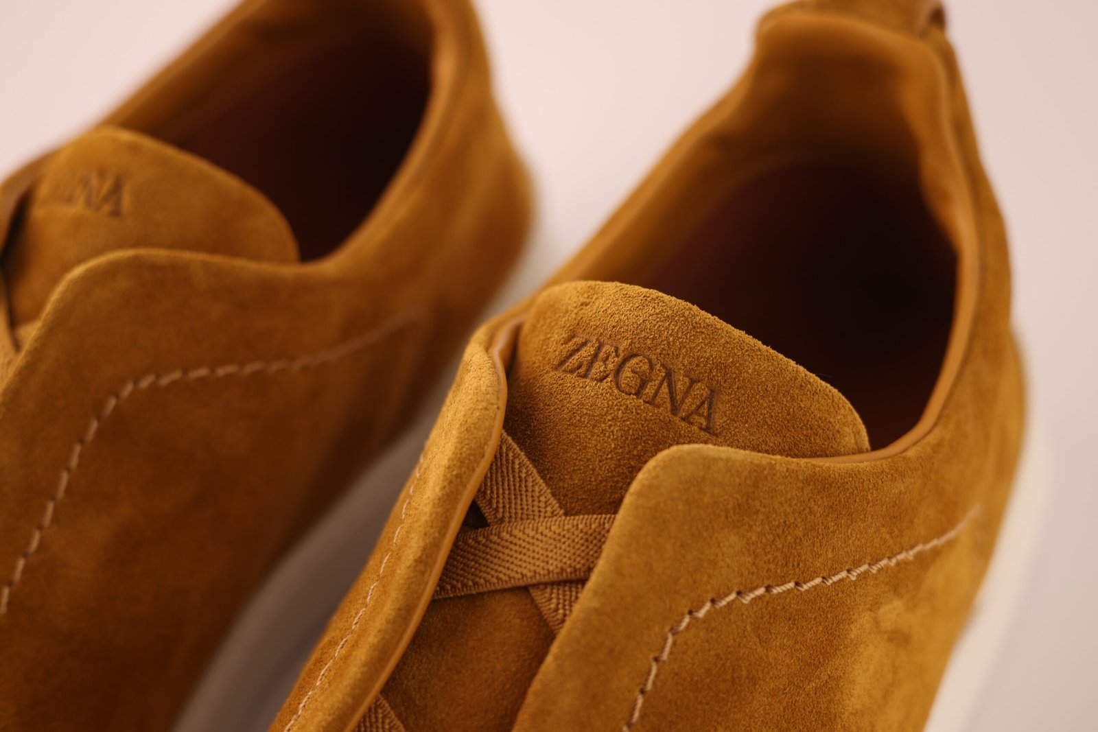 Luxurious slip-on sneakers crafted in Italy from soft suede, featuring Zegna’s iconic triple‑cross elastic detailing for an easy fit, a sanitized leather-lined removable footbed, and lightweight rubber soles—perfectly blending refined style with everyday comfort.