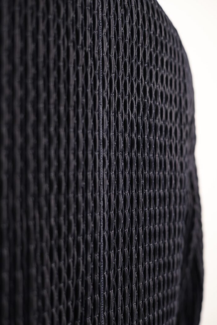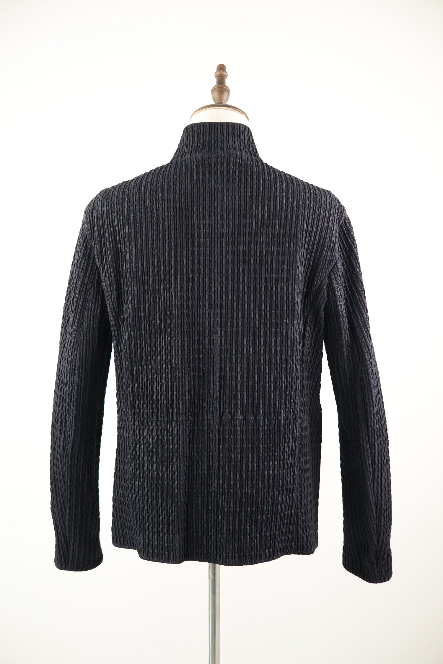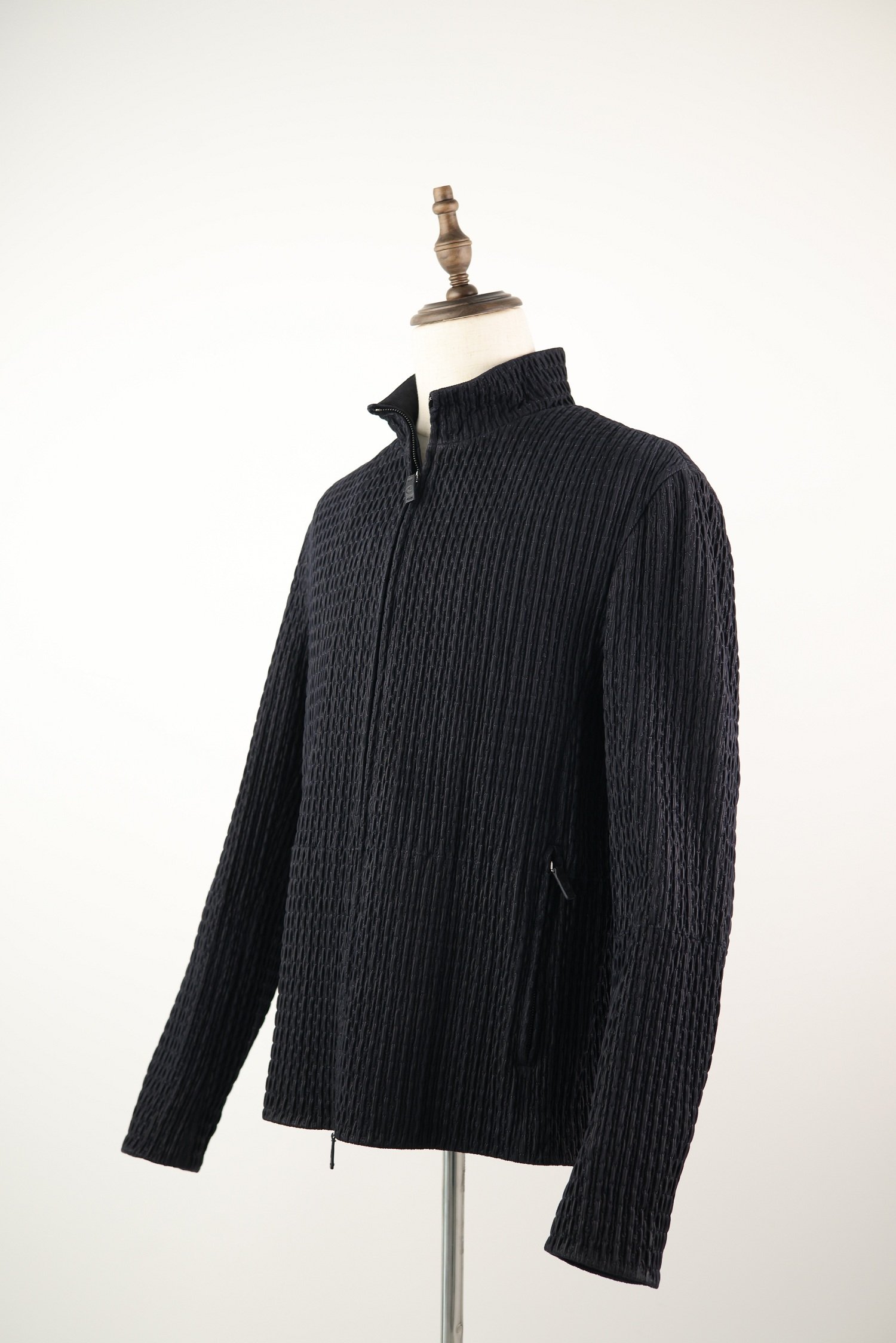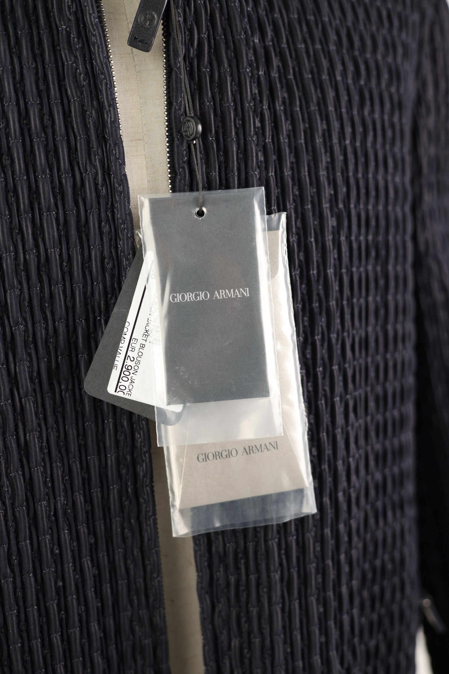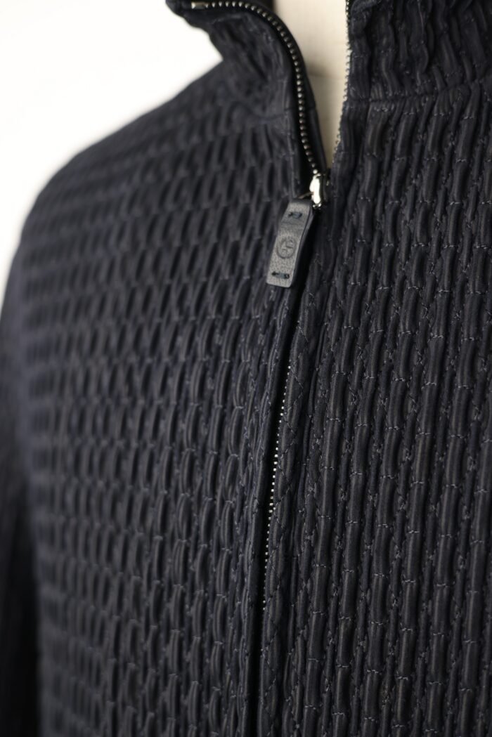 Classic blouson details include a stand or spread collar, front zip or snap-button closure, and ribbed or clean-cut hem and cuffs. Designed with minimalist intent, the jacket focuses on refined lines and tonal finishes, highlighting Armani’s commitment to quiet luxury and masterful craftsmanship.