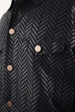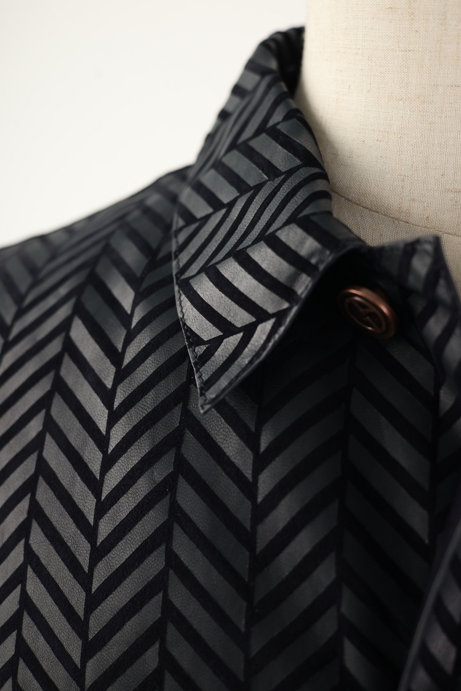 Giorgio Armani Bomber Jacket in Navy Chevron Nappa Leather is a striking reinterpretation of the classic bomber, showcasing the brand’s signature craftsmanship and modern design sensibility. Made from supple Nappa leather, the jacket features a unique chevron-embossed texture that adds depth, character, and a contemporary edge to its refined navy hue.