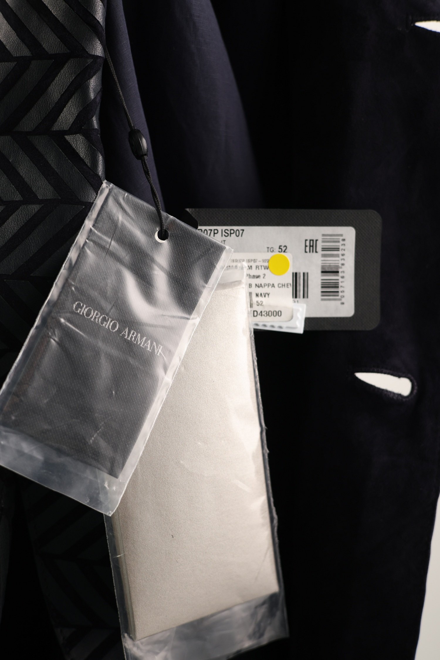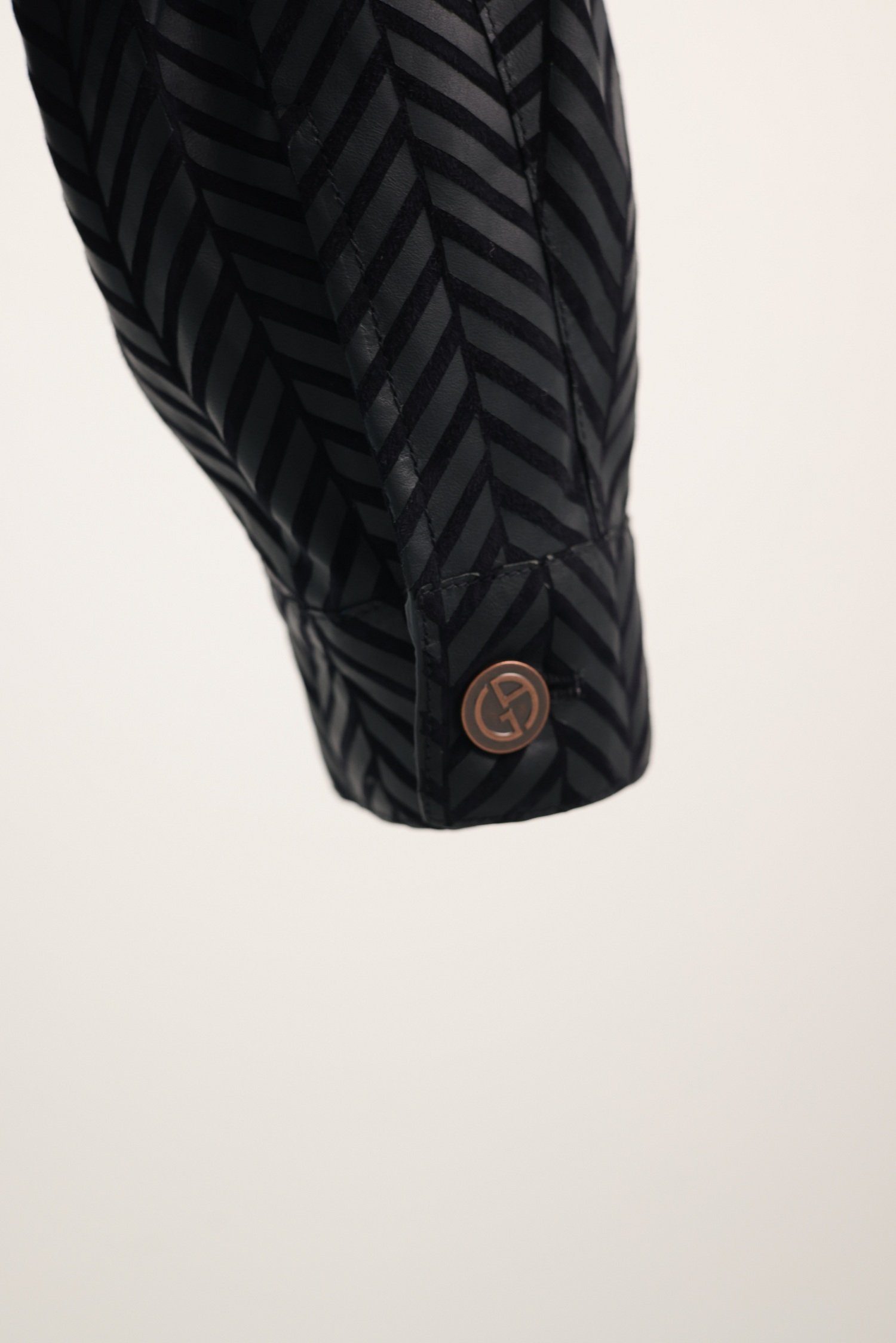 A luxurious navy bomber jacket by Giorgio Armani, crafted from soft Nappa leather with a distinctive chevron texture — merging bold detail with timeless sophistication.