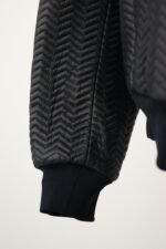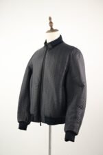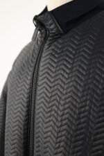 Giorgio Armani Men’s Leather Chevron Bomber Jacket blends classic bomber styling with contemporary sophistication. Made from high-quality smooth leather, the jacket is distinguished by its chevron-quilted pattern, adding both visual depth and subtle structure to the design.