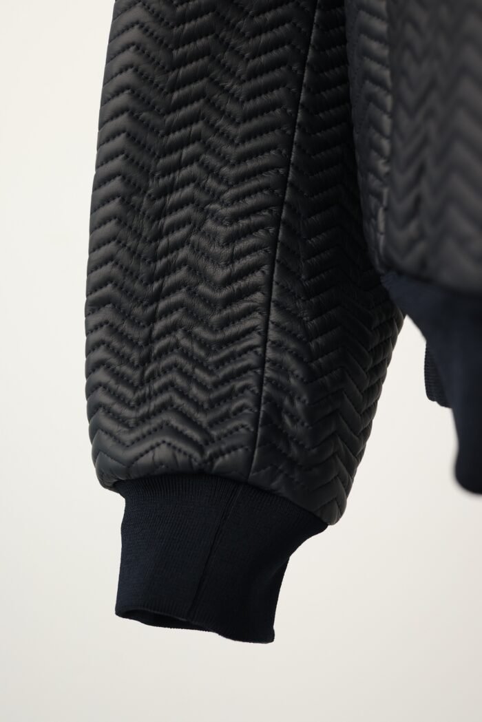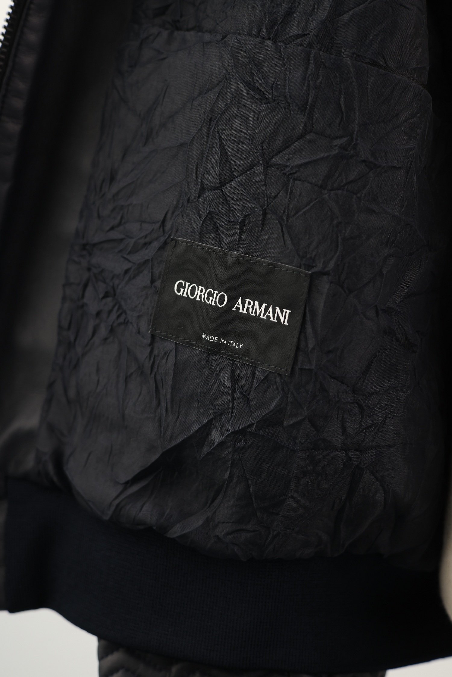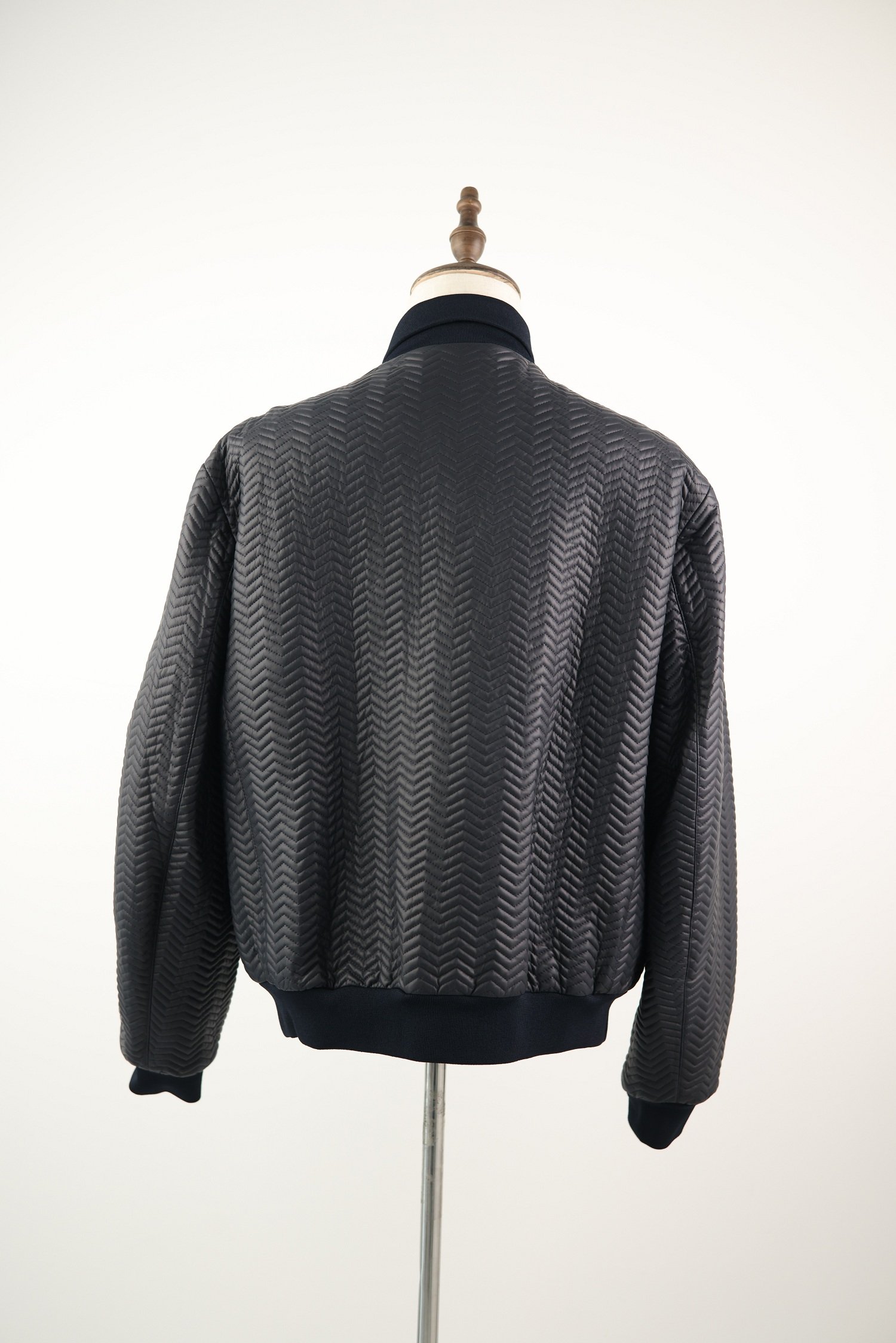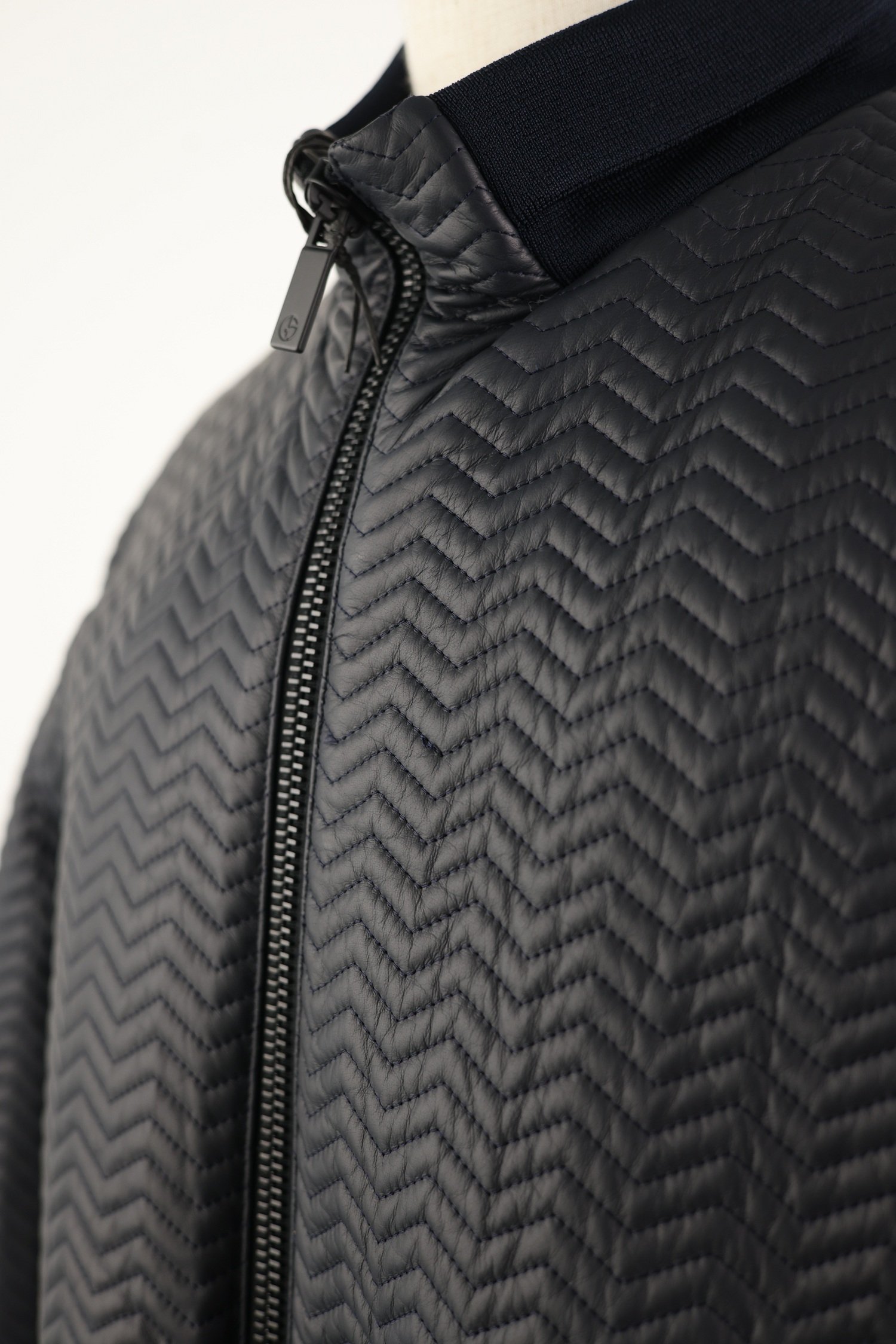 A bold yet refined bomber jacket crafted from premium leather, featuring Giorgio Armani’s signature chevron quilting for a modern, structured silhouette.