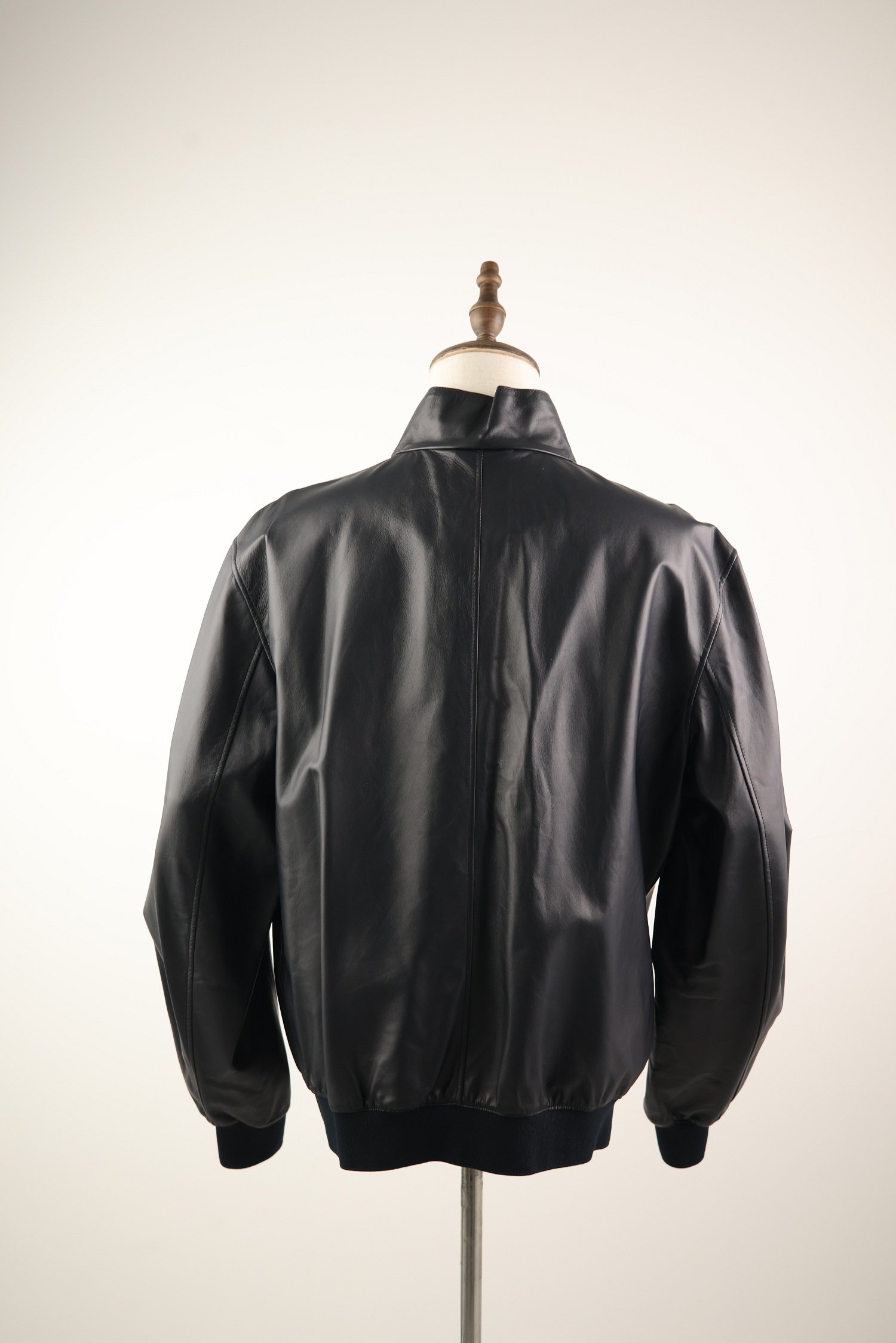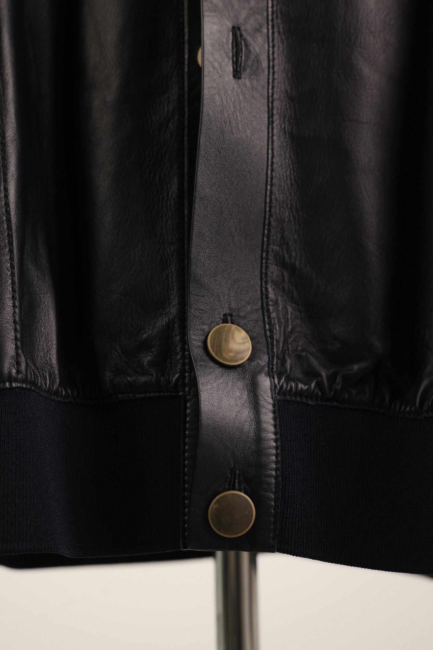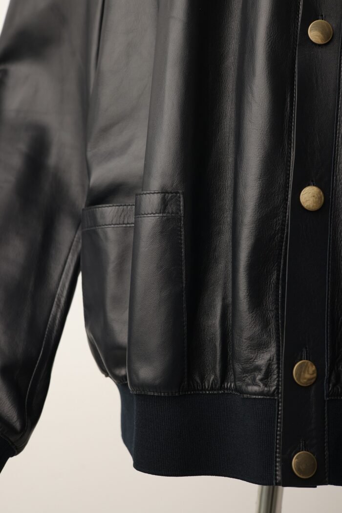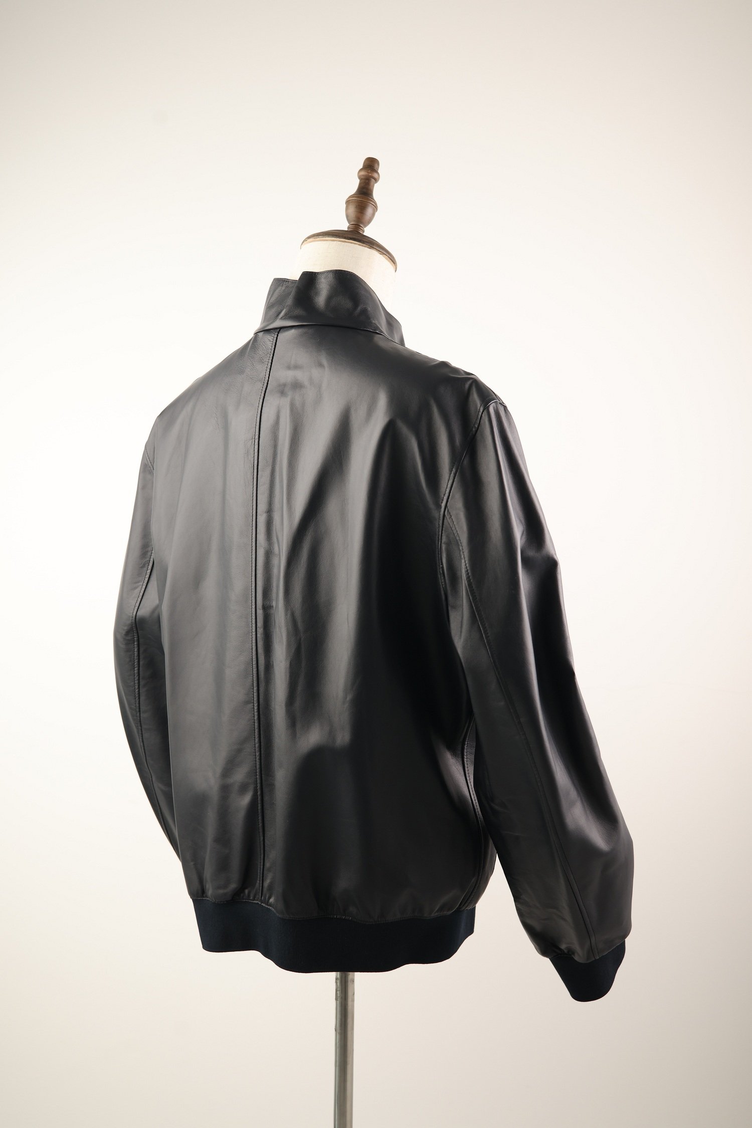 Signature bomber elements — such as a ribbed collar, cuffs, and hem — provide structure and comfort, while discreet side pockets add everyday functionality. The minimalist design allows the leather’s natural richness and fine texture to stand out, reflecting Armani’s commitment to refined simplicity.