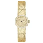 The Dior La D de Dior FV9537 is a testament to the Maison’s commitment to refined craftsmanship and elegant aesthetics. Encased in a 36mm 18k yellow gold case, the watch exudes a warm, radiant glow. The bezel is meticulously set with brilliant-cut diamonds, adding a touch of sparkle that enhances its luxurious appeal.