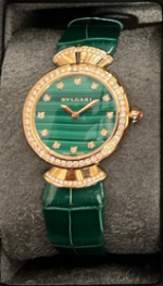 The Bvlgari Diva’s Dream watch with a green dial exudes timeless elegance and refined luxury. This stunning timepiece features a 36mm rose gold case, beautifully complemented by a striking green dial with horizontal stripes. The dial is adorned with diamond hour markers, adding a sparkling touch of glamour. Surrounding the dial is a diamond-encrusted bezel, enhancing the watch’s luxurious appeal. The watch is finished with a rich green alligator leather strap, which contrasts beautifully with the rose gold case, creating a harmonious and sophisticated look. This Diva’s Dream model is perfect for those who appreciate fine craftsmanship and want a statement piece that stands out for both its beauty and precision.