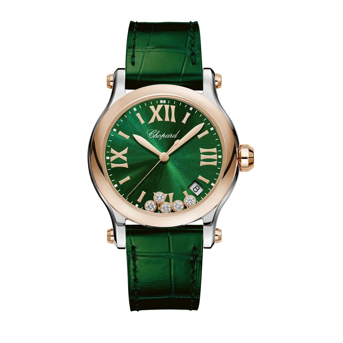 The Chopard Happy Sport 36mm (Ref. 278582-6005) is a captivating expression of luxury and playfulness. Its 36mm stainless steel case is adorned with an 18k rose gold bezel, creating a harmonious blend of metals. The green dial features polished rose gold-tone hands and Roman numeral hour markers, providing a striking contrast and ensuring legibility.