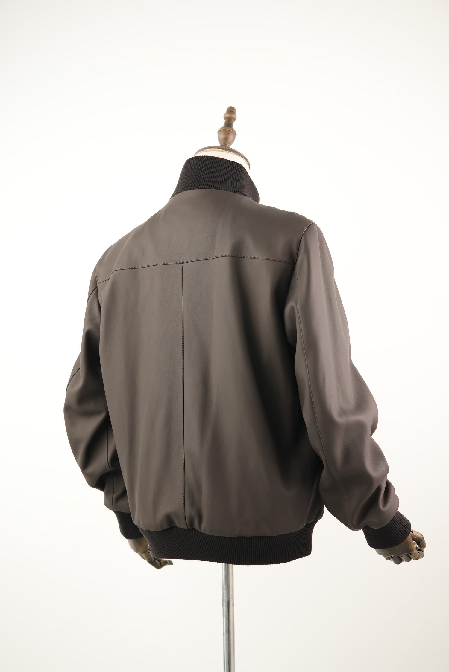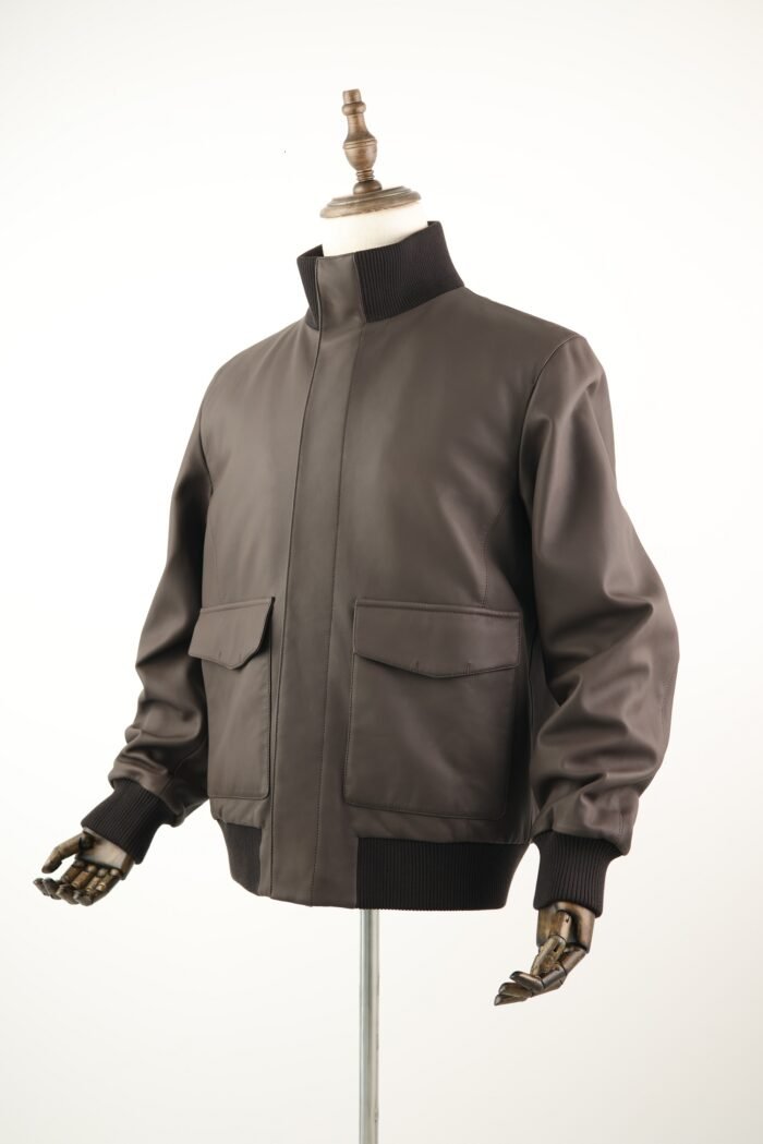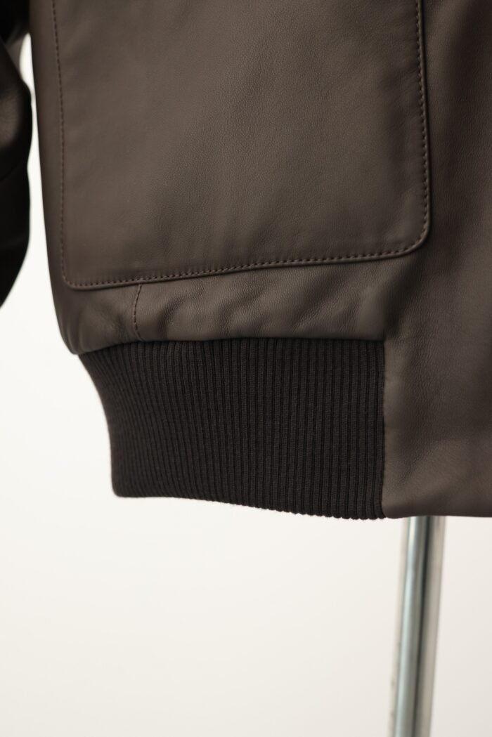 The deep brown tone adds classic character, while ribbed knit trims at the collar, cuffs, and hem provide structure and a tailored fit. Functional details like a smooth front zip, side pockets, and a refined inner lining enhance both comfort and practicality.