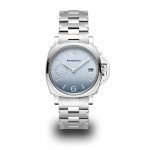 The Panerai Luminor Due 38mm P900 (Light Blue) features a 38mm stainless steel case with a light blue dial, luminous hour markers, a date display at 3 o’clock, and the signature crown guard. Powered by the Panerai P900 movement, it offers a 72-hour power reserve.