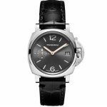 The Panerai Luminor Due 38mm P900 (Black) features a 38mm stainless steel case with a black dial, luminous hour markers, a date display at 3 o’clock, and the signature crown guard. It is powered by the Panerai P900 movement, offering a 72-hour power reserve.