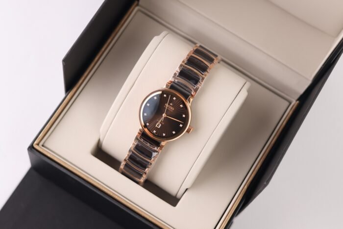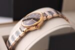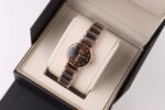 Bracelet: Polished rose‑gold PVD-coated steel links with brown high-tech ceramic center inlays; equipped with a three-fold brushed clasp for comfort and durability .