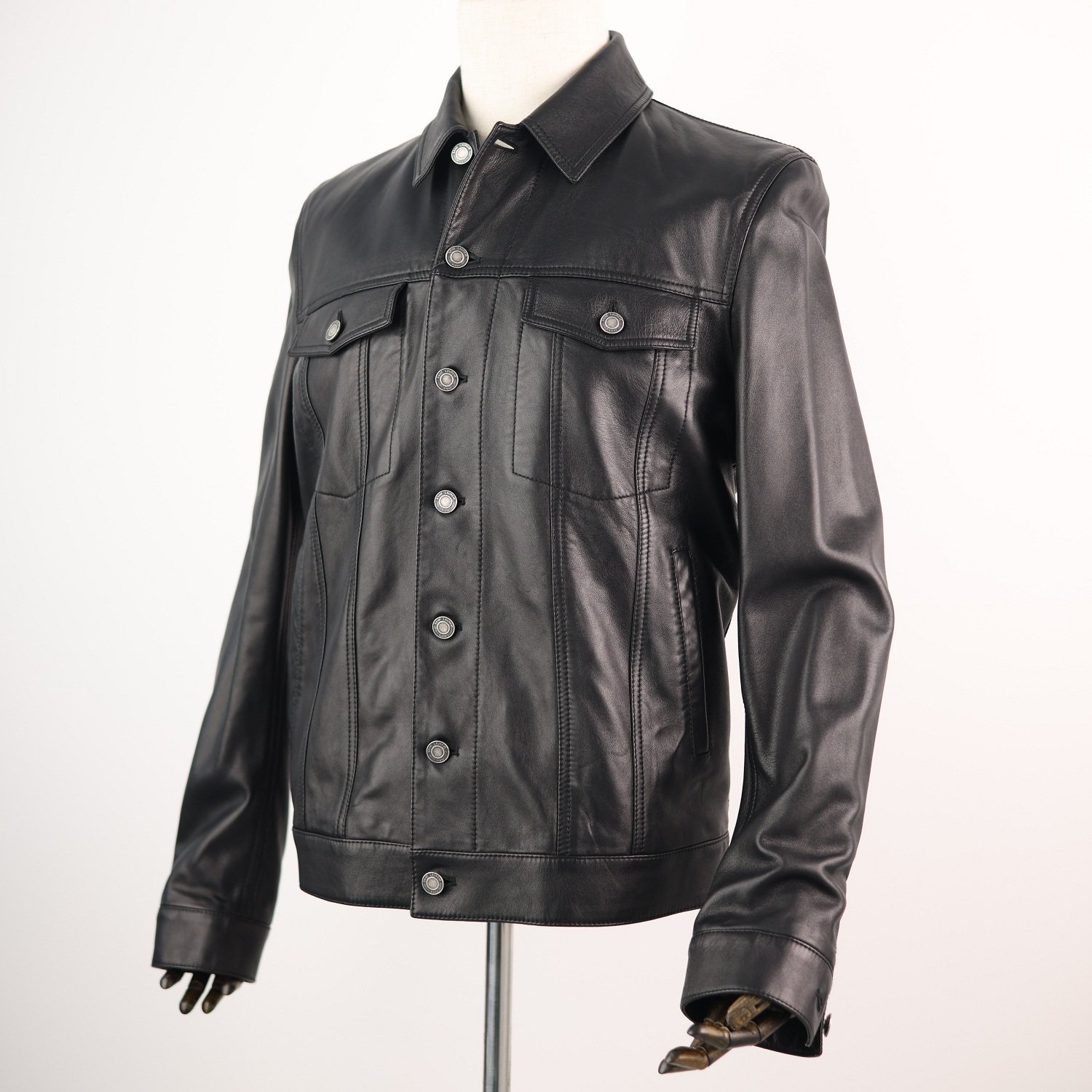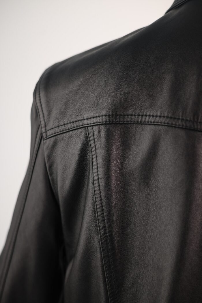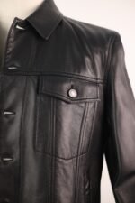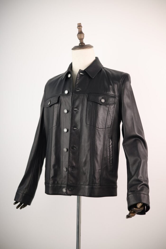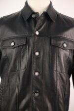 A sleek, black denim-style jacket crafted entirely from buttery lambskin leather. Featuring flap chest pockets, side-entry pockets, and adjustable waist tabs—this Italian-made piece blends rugged tailoring with high-end luxury.