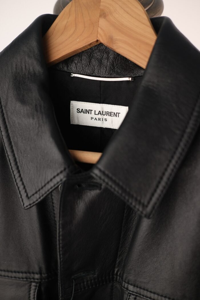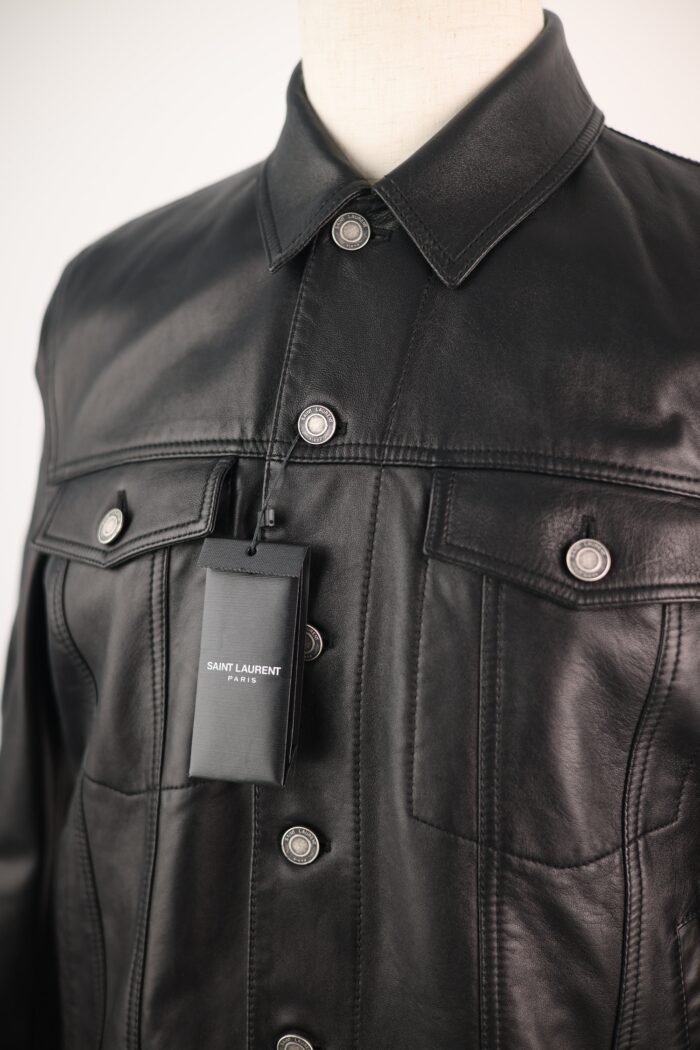 The Saint Laurent Lambskin Denim Jacket elevates the rugged Americana staple into the realm of high fashion. Constructed from smooth, soft lambskin leather, this piece mirrors the design of a traditional trucker jacket but replaces denim with rich leather for a more elevated and refined appeal.
