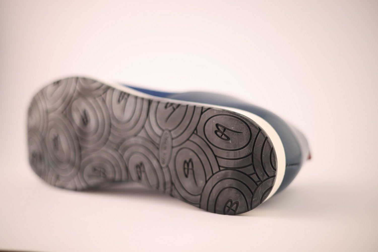 The SB221 sneaker showcases exceptional Italian craftsmanship and modern style. Its upper blends elastic, breathable knit fabric with hand-painted full-grain calfskin leather, accented by a woven “SB by Stefano Borella” logo detail for added sophistication.