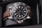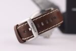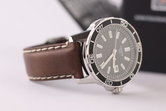 A bold and modern 44mm men’s watch featuring a black dial, stainless steel case, brown leather strap, and Swiss quartz movement—built for versatile everyday wear with sporty elegance.