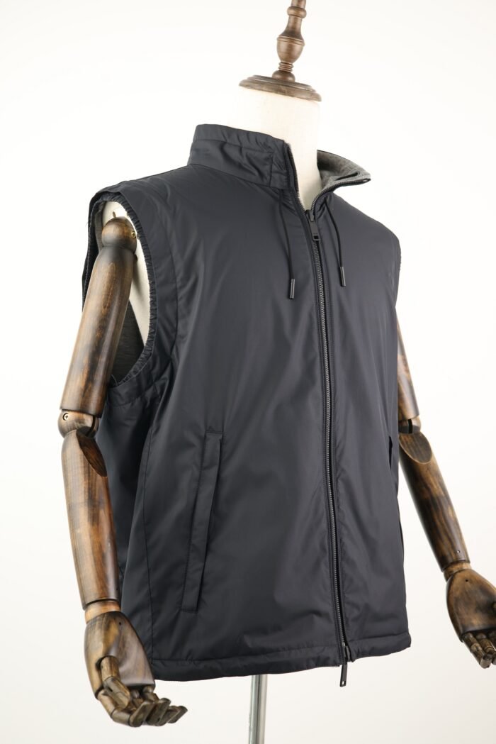 A versatile black nylon vest with a reversible design, offering two stylish looks in one — lightweight, functional, and unmistakably refined.