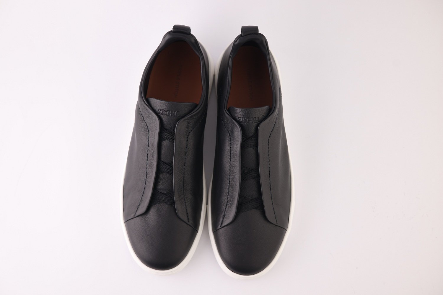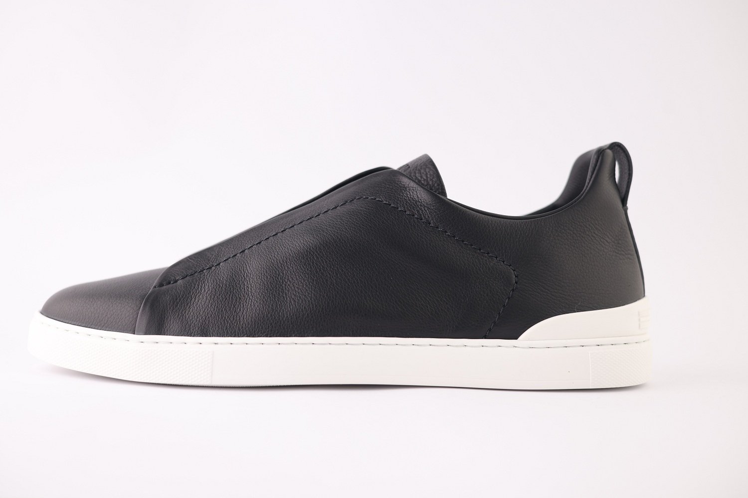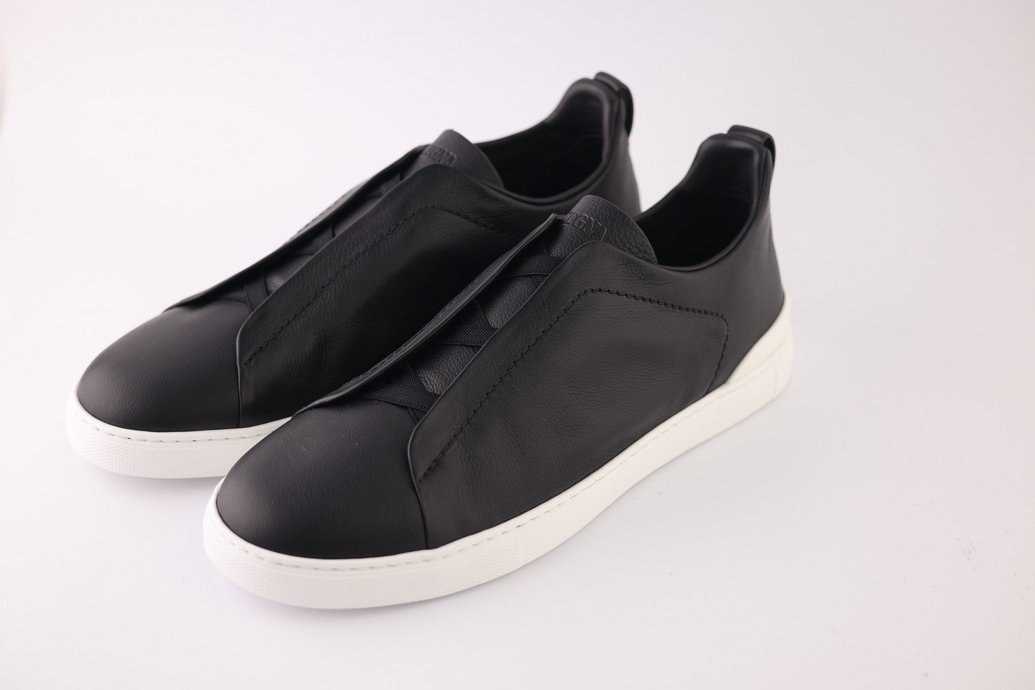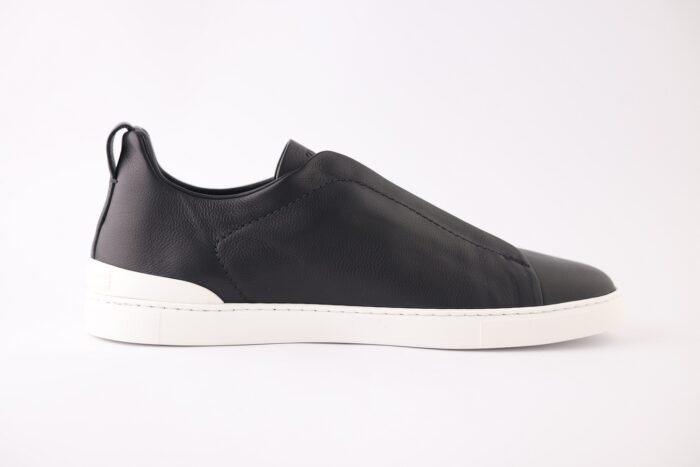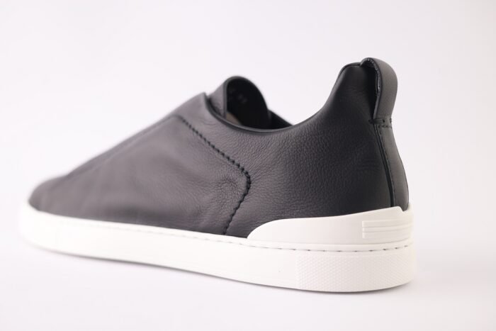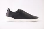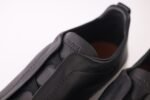 The sleek black upper is complemented by Zegna’s signature Triple Stitch™ elastic crossover detail — a refined nod to classic hand-stitching that also allows for easy slip-on wear. A lightweight rubber sole ensures smooth steps and dependable traction, making them ideal for both travel and urban living.