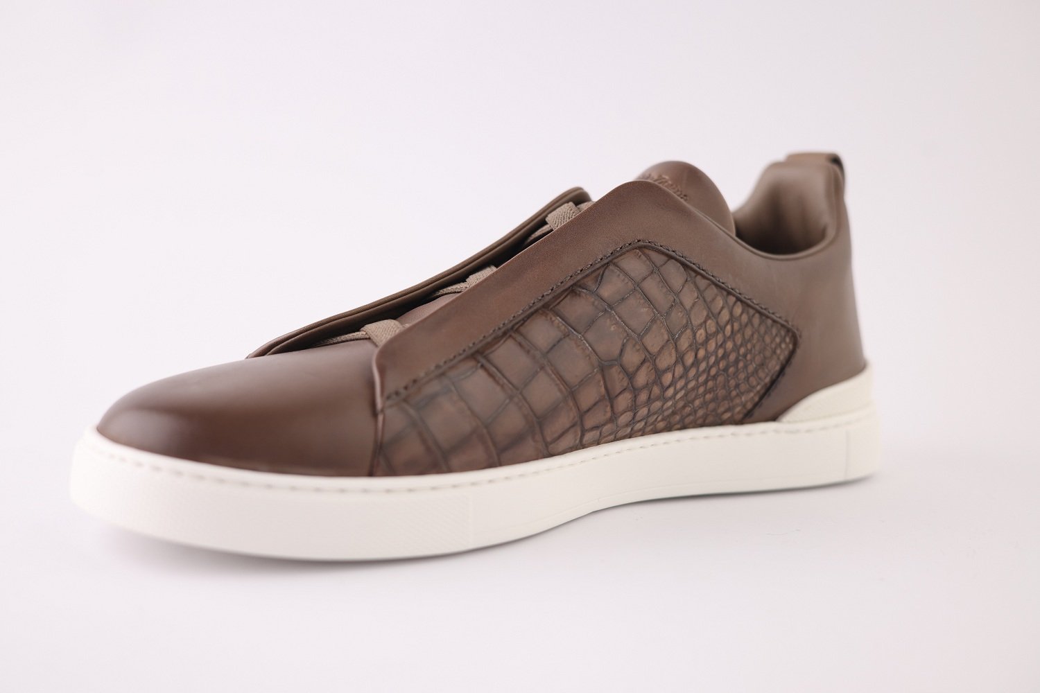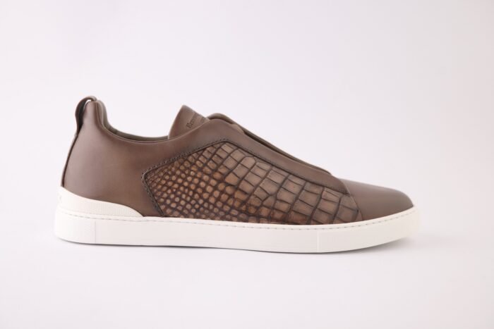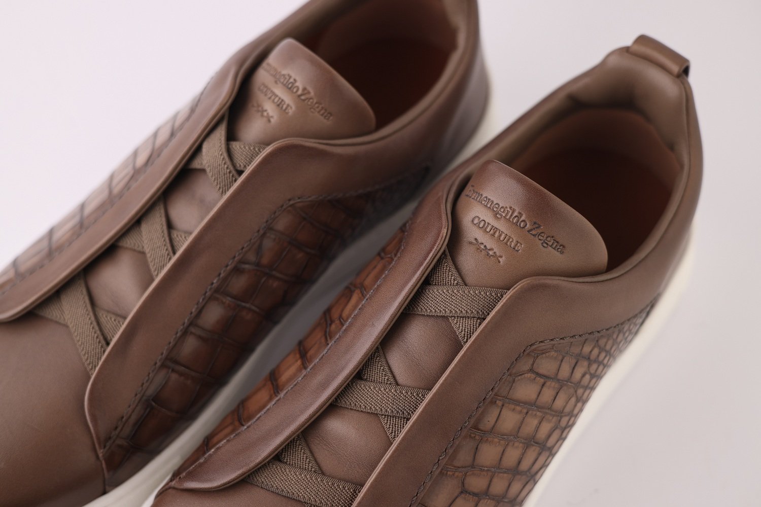 Zegna Brown Crocodile Leather Triple Stitch™ Sneakers are a rare expression of elevated craftsmanship and contemporary elegance. Meticulously crafted from premium genuine crocodile leather, the rich brown finish highlights the natural scales’ unique pattern, giving each pair a distinct, luxurious character.