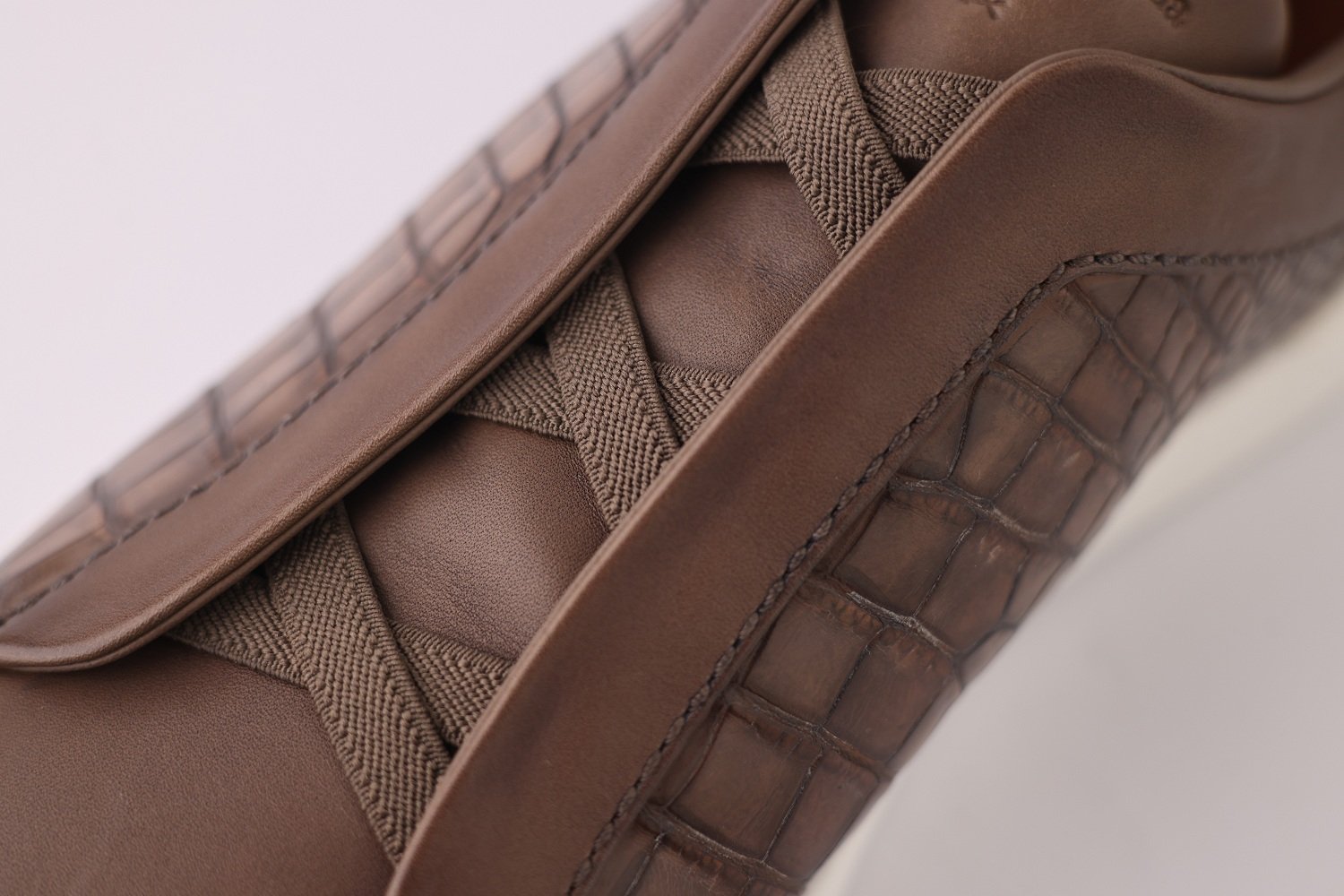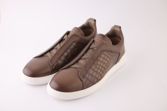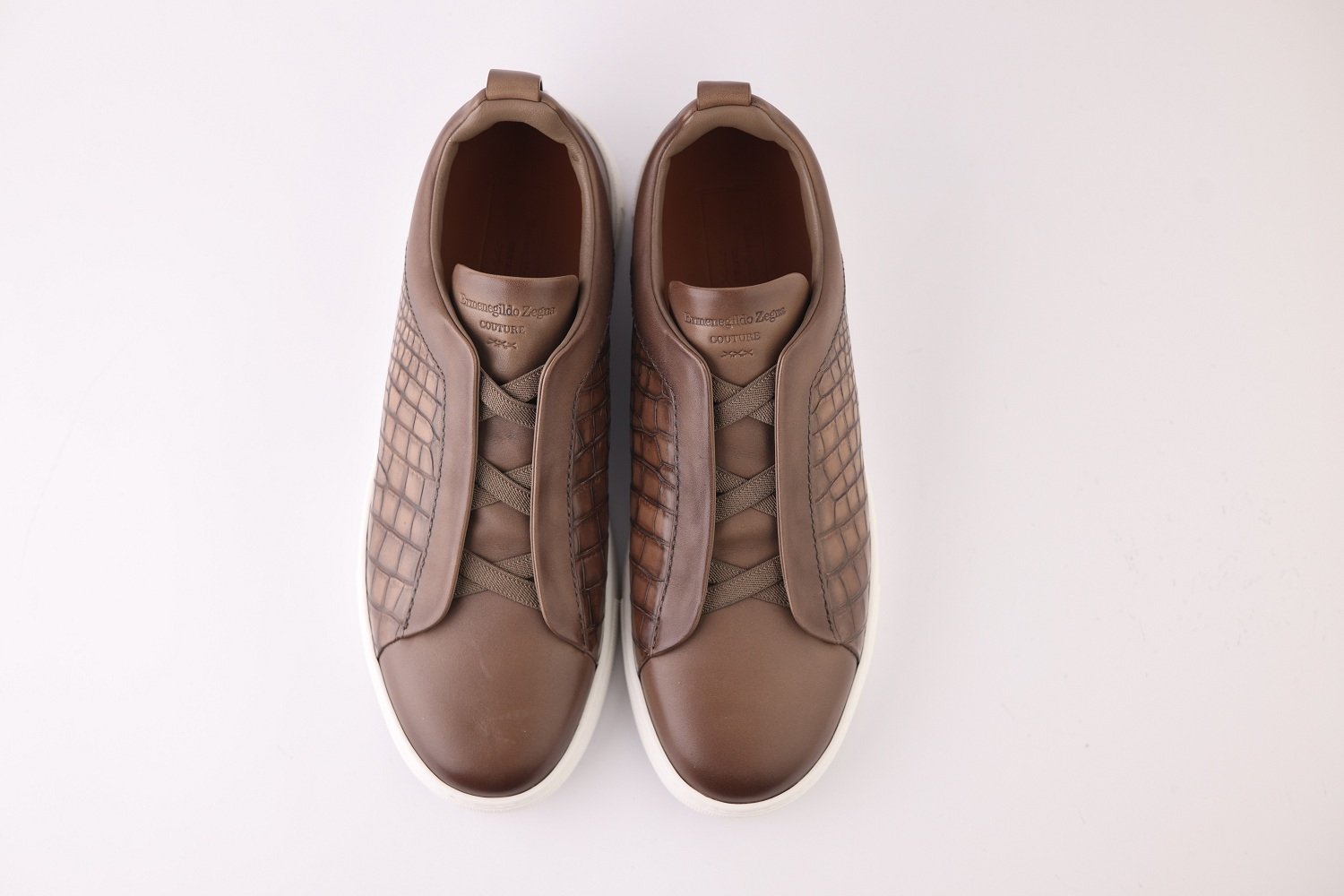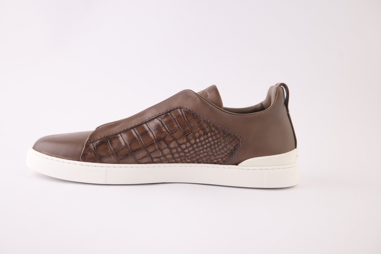 Zegna Brown Crocodile Leather Triple Stitch™ Sneakers are a rare expression of elevated craftsmanship and contemporary elegance. Meticulously crafted from premium genuine crocodile leather, the rich brown finish highlights the natural scales’ unique pattern, giving each pair a distinct, luxurious character.