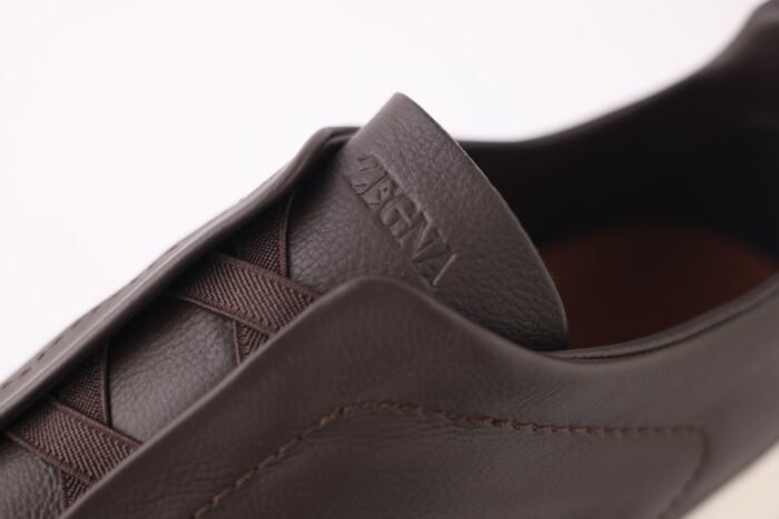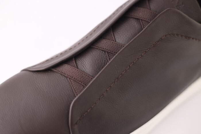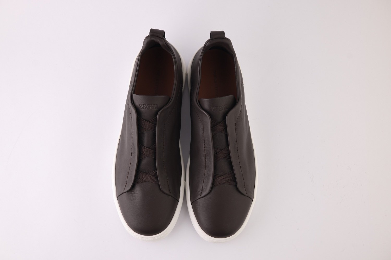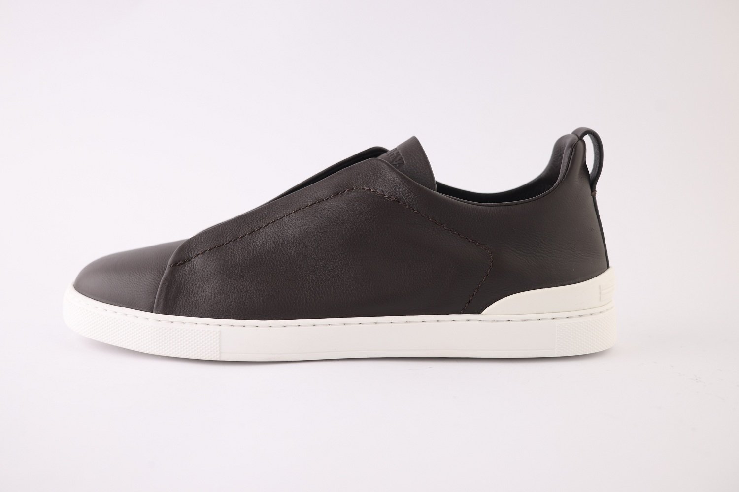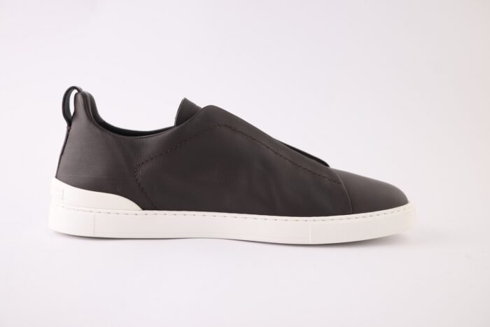 Dark brown sneakers crafted from Zegna’s signature SECONDSKIN leather, featuring the iconic Triple Stitch™ for effortless slip-on sophistication.