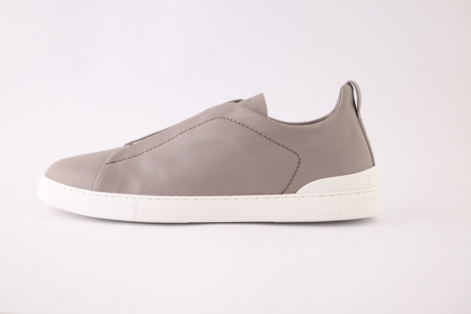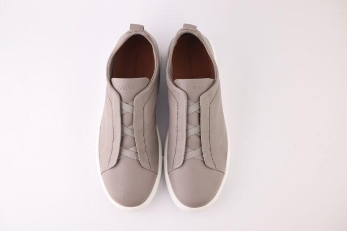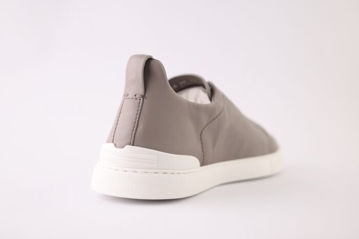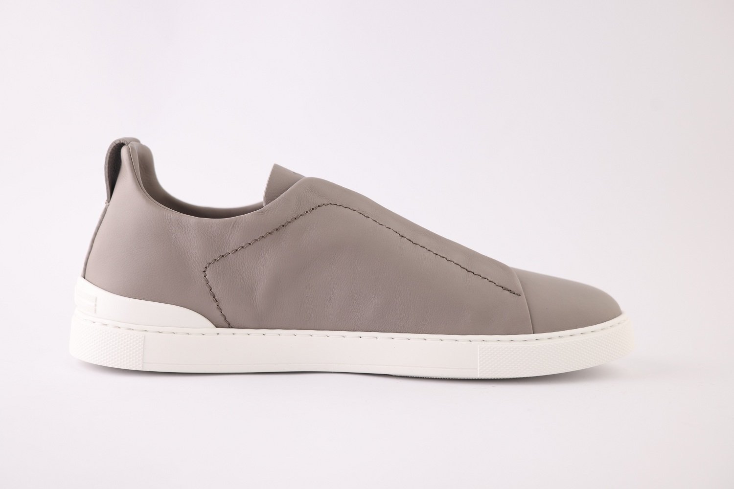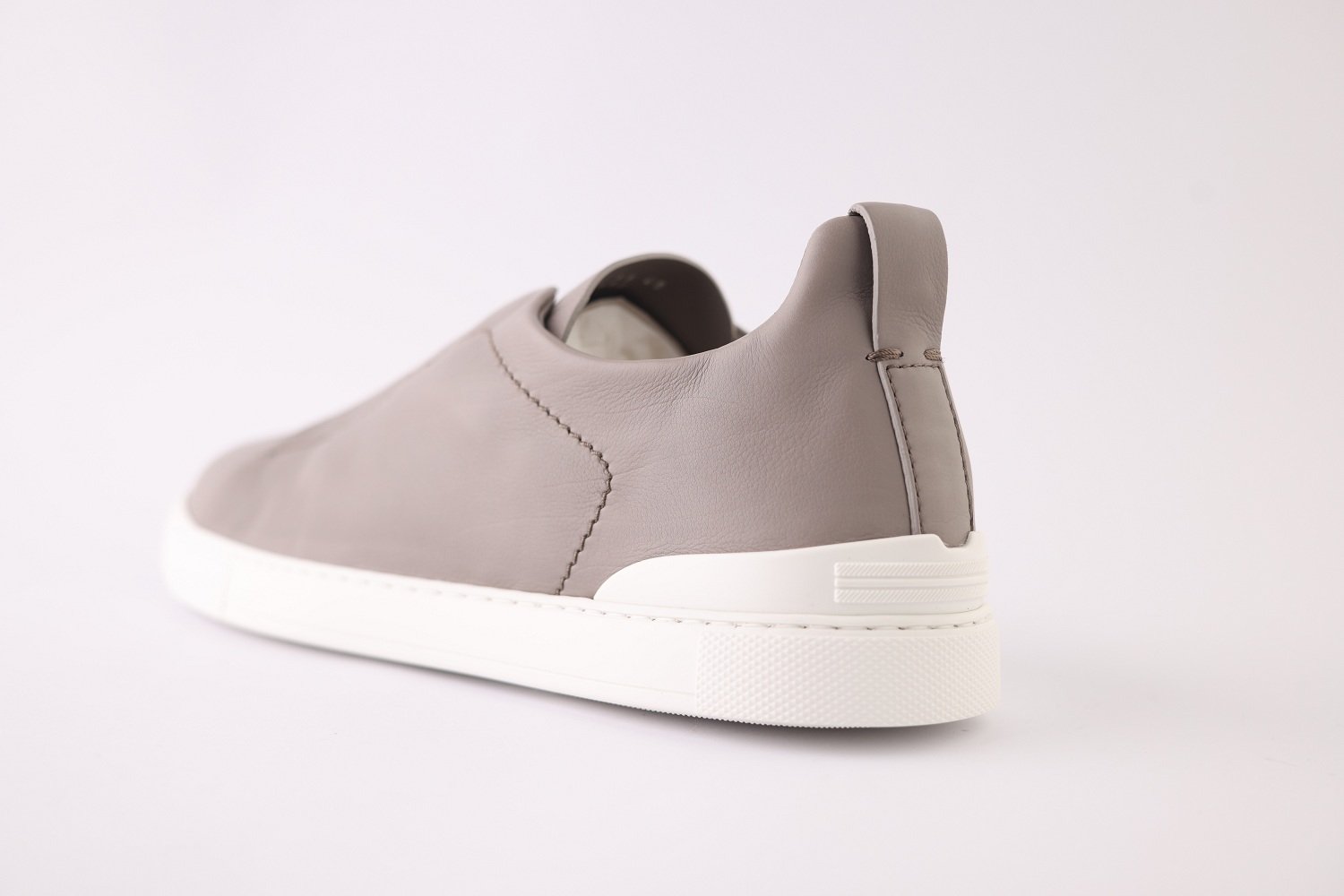Ultra-soft light grey sneakers in Zegna’s SECONDSKIN leather, enhanced with the signature Triple Stitch™ elastic detail for effortless luxury.